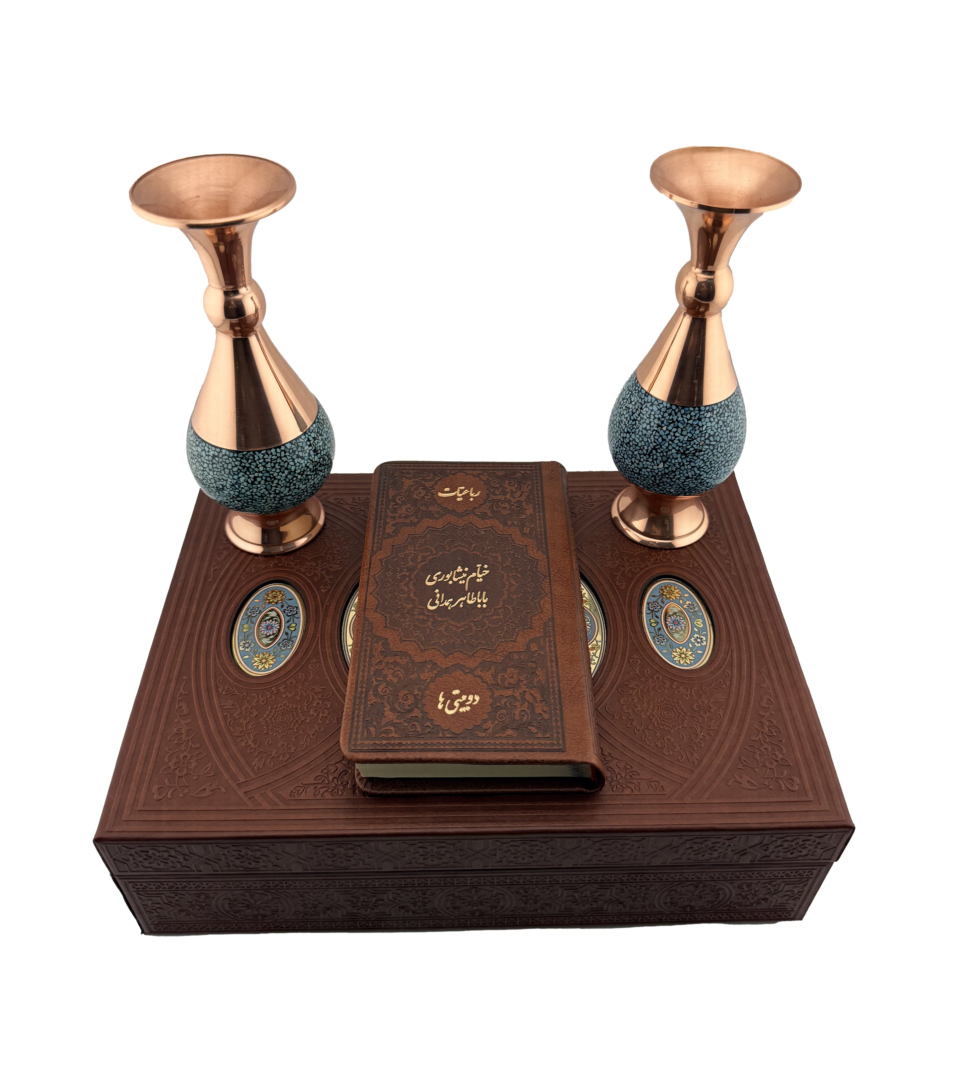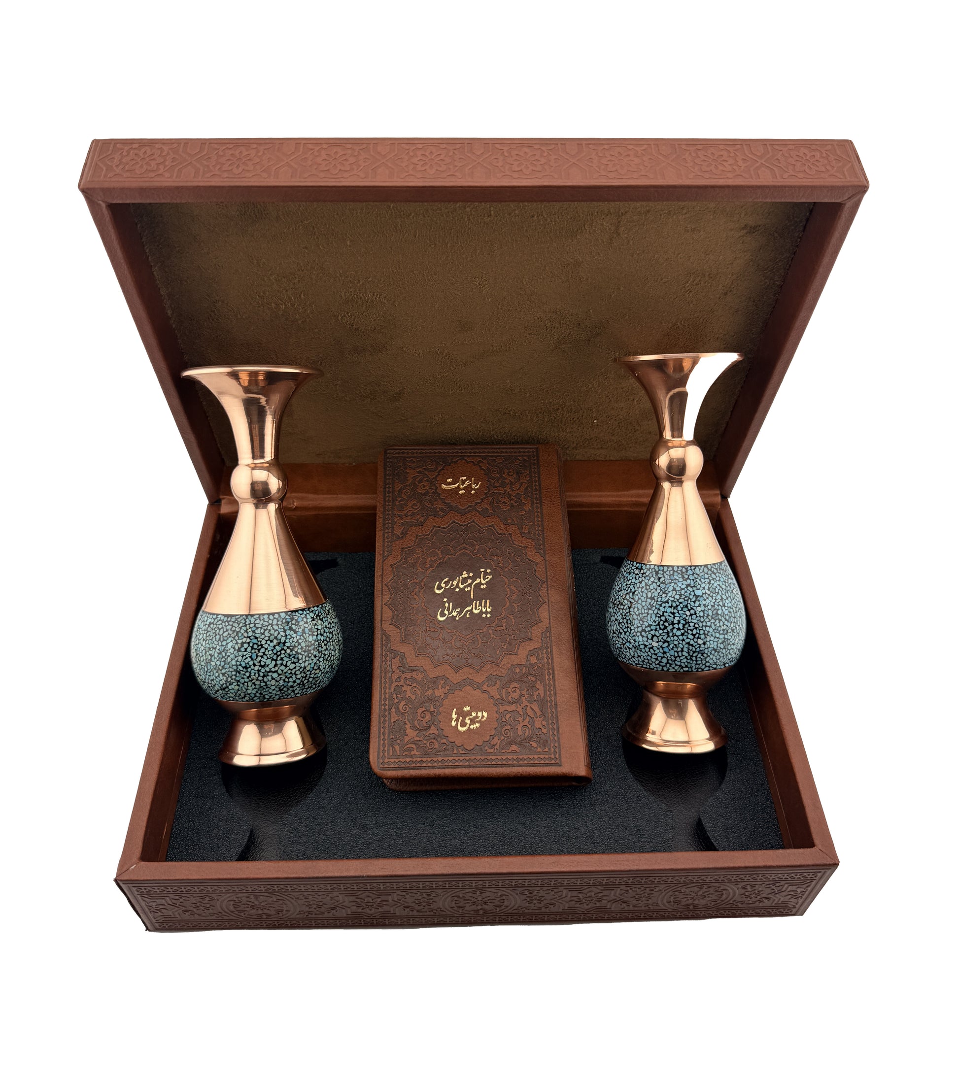 A refined cultural gift set featuring pocket-size (پالتویی) edition of Rubaiyat of Khayyam/ Poems of Baba Taher, and Two turquoise-inlaid decorative vases in a handmade leather-style box. This compact set is ideal for thoughtful gifting and everyday reading.