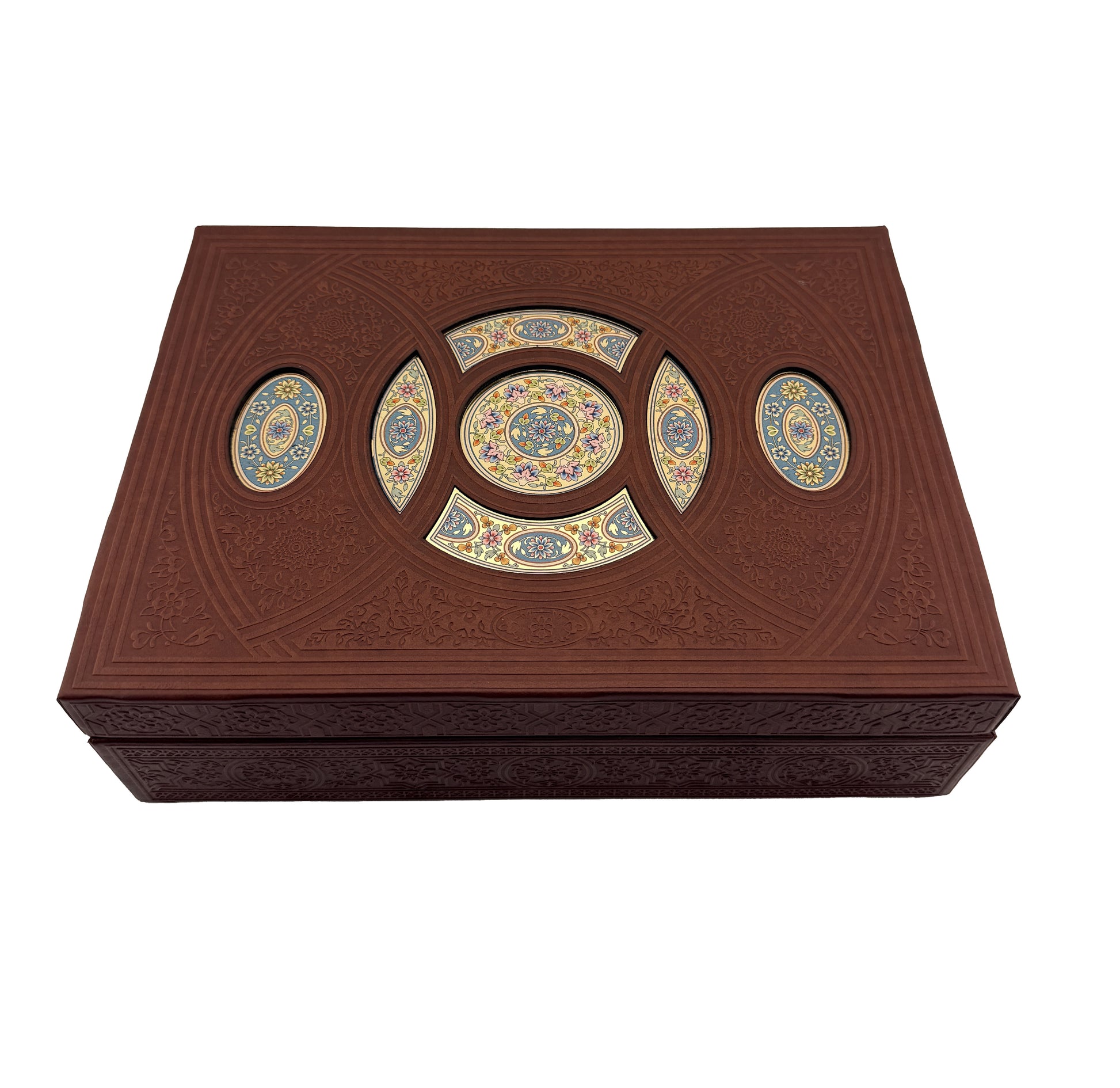 A compact gift set in a handmade, leather-style box. Inside, you’ll find pocket-size (پالتویی) editions of leather-cover style Divan-e Hafez, Bustan, and Golestan of Saadi. It also includes a matching ballpoint pen and rollerball—an elegant set that’s ready to gift.