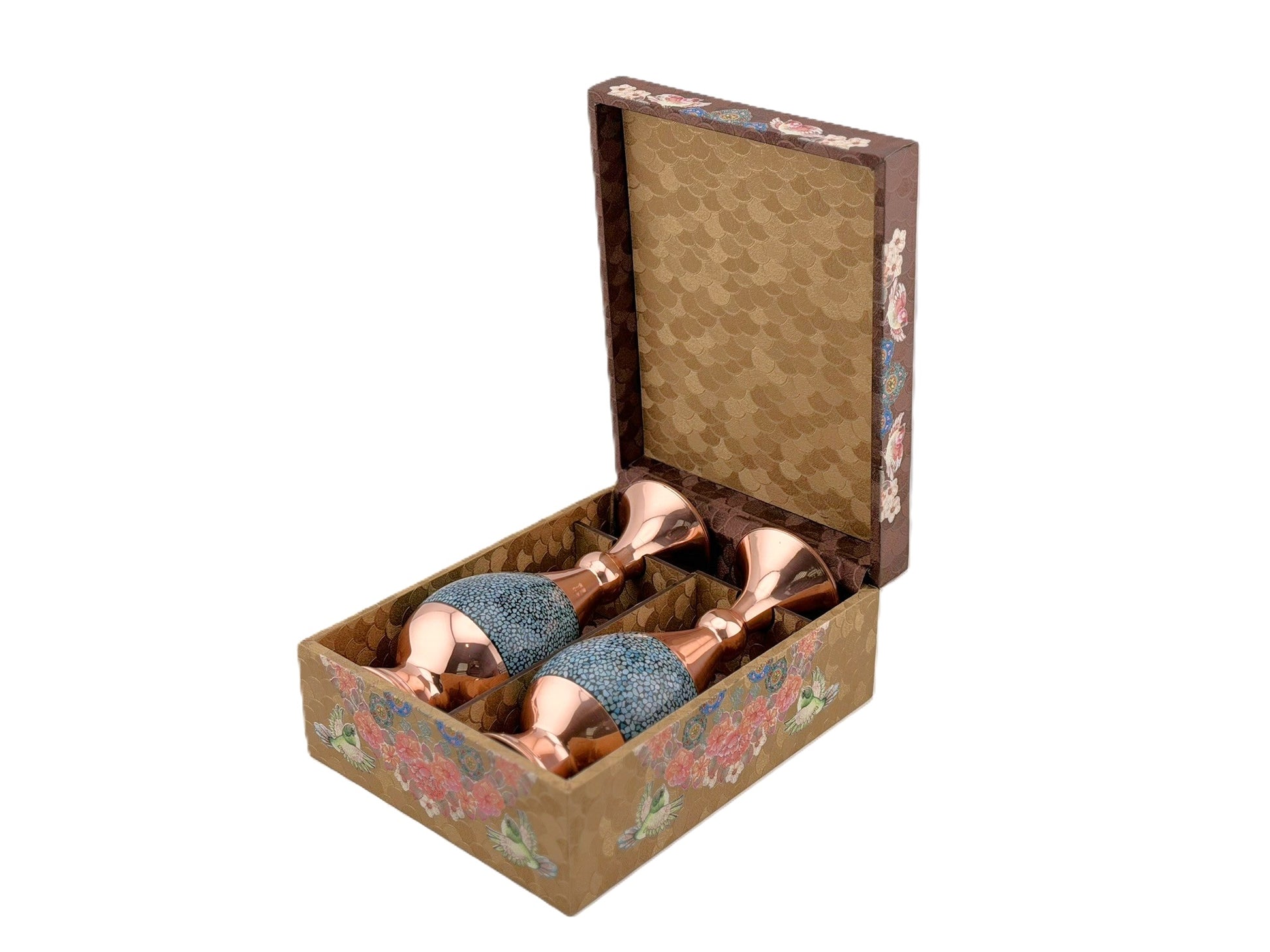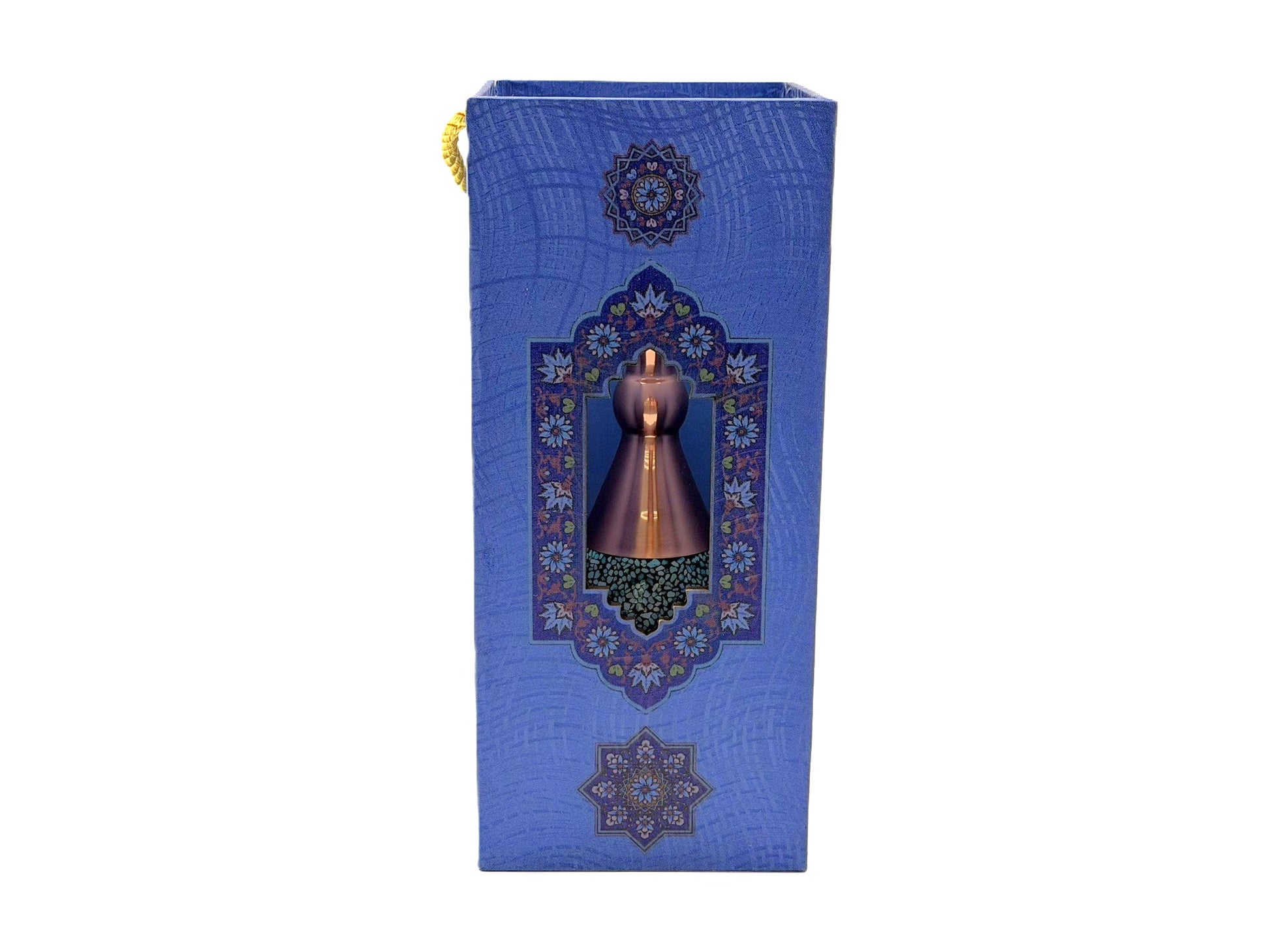 Bring elegance and tradition into your home with this handcrafted turquoise inlaid vase. Genuine turquoise stones are meticulously set on a polished copper body, creating a striking mosaic of shimmering blue and radiant copper. This traditional FiroozehKoobi (turquoise inlaying) technique makes the vase not only a functional vessel but also a collectible work of art.